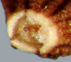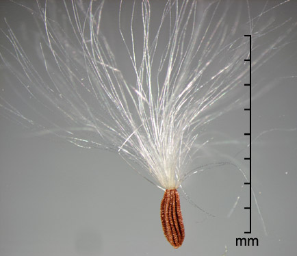 Fruit an achene, flattened, narrowly elliptical to oblong in outline, frequently slightly curved, (1.8)2.4–4.5 mm long, 0.6–1.4 mm wide, 0.3–0.6 mm thick, narrowly elliptical in cross section; both ends truncate. Covered with ca. 10–16 prominent longitudinal ribs; ribs cross-grooved, appearing tubercled. Dark brown to light- and reddish-brown, dull to faintly glistening. Scar a round, slightly oblique, 4-segmented collar, rim and cavity cream colored. Apex horizontal, a +/– oval ring, cream colored, surrounding slender whitish style base variable in appearance or inconspicuous. Pappus of numerous white hairs, 1.5 cm long, +/– persistent. Embryo straight, spatulate; endosperm absent.