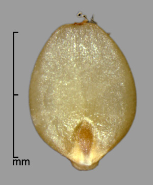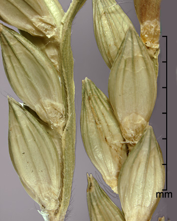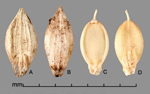 Spikelets of 1 fertile floret and 1 basal sterile lemma; spikelet elliptic, strongly dorsally compressed, plano-convex, apex acute; 2.5–5.5 mm long, 1.5–2.25 mm wide. Glumes membranous, glabrous, dissimilar; lower glume ca. 1/4 – 1/3 (1/2) as long as spikelet, wrapping around the base of the spikelet, 3–5-nerved; upper glume as long as spikelet, 7–13-nerved. Sterile lemma similar to upper glume, but 5–7-nerved. Fertile lemma elliptic, 2.6–3.5 mm long, 1.5–2 mm wide, indurate, surface with numerous, low transverse ridges, apex obtuse and awned, awn 0.3–1 mm long, not extending beyond tip of spikelet; lemma margins inrolled, enclosing palea. Caryopsis 2–2.5 mm long; embryo ca. 3/4 as long as caryopsis; hilum linear to narrowly obovate, 1/3 length of caryopsis.