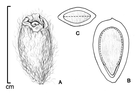 A, fruit; B, embryo in situ; C, transection of fruit; drawing by Lynda E. Chandler