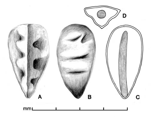 A–B, seed in two views; C, longitudinal section of seed showing embryo; D, transection of seed; drawing by Lynda E. Chandler