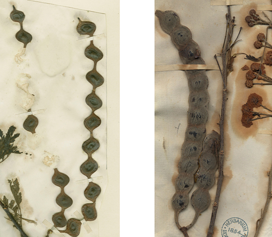 herbarium specimens showing moniliform (subspecies nilotica) and non-moniliform (subspecies adstringens) fruits of A. nilotica; photos & specimens: © The Board of Trustees of the Royal Botanic Gardens, Kew