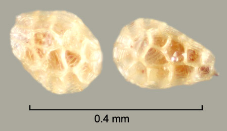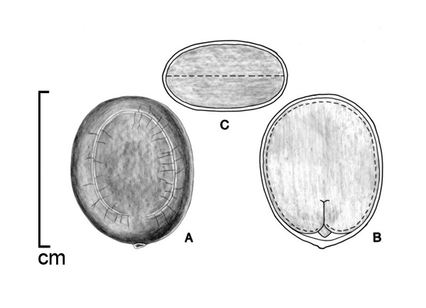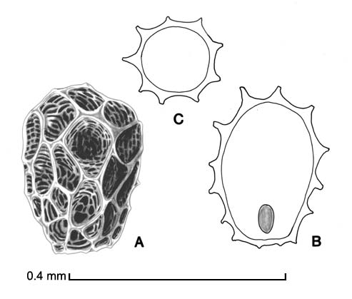 Aeginetia indica. A, seed; B, longitudinal section of seed showing embryo; C, transection of seed; drawing by Lynda E. Chandler