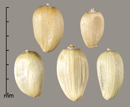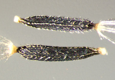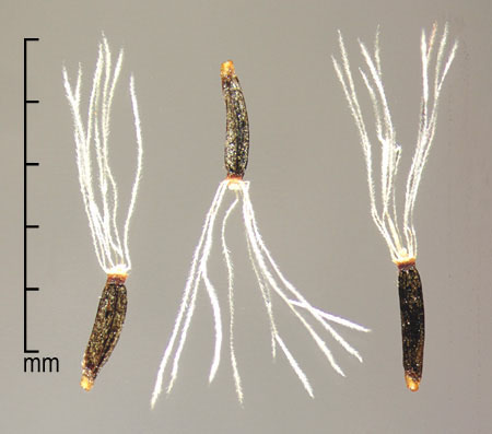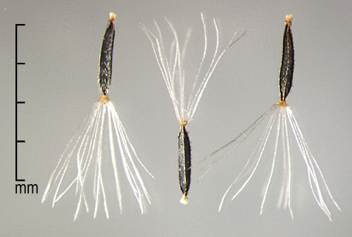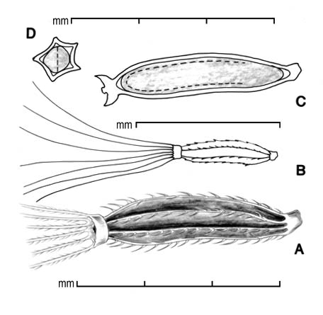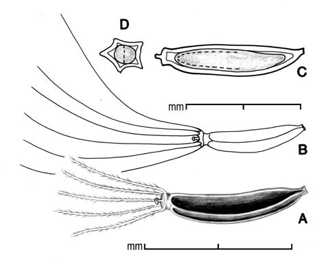 A, achene; B, outline showing entire pappus; C, longitudinal section showing embryo; D, transection; drawing by Lynda E. Chandler