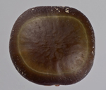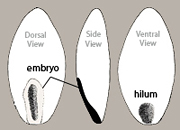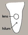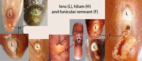 The scar on a seed where the funiculus attached the seed to the pericarp tissues is called the hilum. The lens (Figure 27) is a mound, pad, or area of tissue situated near the hilum that acts as a site of initial water entry and regulation by the otherwise relatively impermeable seed. It is often more visible than the hilum and therefore mistaken for that structure. If a funiculus remnant adheres to the hilum, which is not unusual, then the distinction between the two structures is clear. Aiding in the identification of the lens is the fact that it is typically larger than the hilum, is often whitish or yellowish, and may be raised, flush or recessed. See examples below in Figure 28.