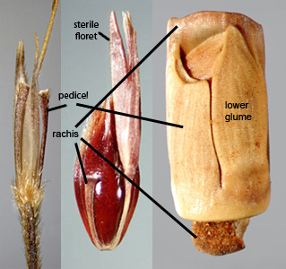 Complicating the identification process of spikelets is that accessory structures such as easily recognized sterile florets (not those that are the lemma and palea or lemma alone appearing merely as additional bracts in the disseminule), pedicels (i.e., spikelet-bearing stalks), or parts of the inflorescence stem can also be attached to the disseminule (Figure 18).