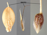 Since awns are typically long relative to the size of the floret or spikelet, they are easily broken off. Sometimes dissection to remove the outer bracts and expose the lemma will reveal that a small piece of a broken awn is still attached to the lemma.