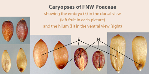 The caryopsis is commonly a dry, indehiscent, one-seeded fruit in which the seed is fused to the pericarp in the hilar region only. A naked caryopsis is easy to recognize. The pericarp of this small structure is often translucent, revealing the hilum at the base of one side of the fruit and the peripheral embryo (contiguous with the testa) at the base of the other side of the fruit (Figure 7). In cases where the pericarp is not translucent, the side view outline of the fruit and/or the texture of the pericarp typically reveal the position of the embryo (Figures 8, 9).