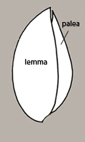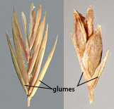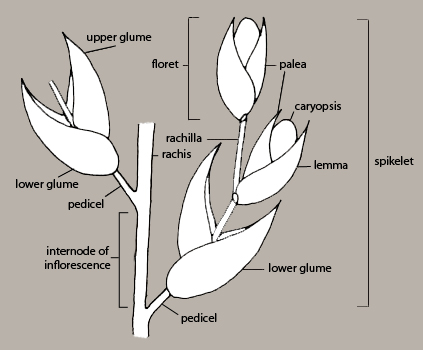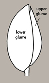 What constitutes a spikelet can be difficult to determine. It often consists of 4 or more bracts surrounding a single caryopsis, which here we refer to as a reduced spikelet. The outermost pair of bracts are called glumes — the one positioned lowest on the floral axis is called the lower glume, the other is the upper glume. The glumes sometimes entirely enclose the inner bracts and caryopsis and therefore the structure resembles a floret (Figure 14). However, the inner bracts can be revealed by teasing open the glumes at the apex of the structure when the glumes are relatively rigid or by scraping them off of the inner bracts when the glumes are more papery and fragile.