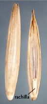 In some grasses, a piece of the axis (called the rachilla) to which successive florets are attached may remain attached to the base of the floret (Figures 6, 12)