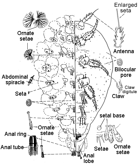 Abdominal and thoracic spiracles dorsal and projecting from derm; femur and trochanter fused; dorsal setae unusually ornate; enlarged seta at apex of antenna; protruding anal lobes.