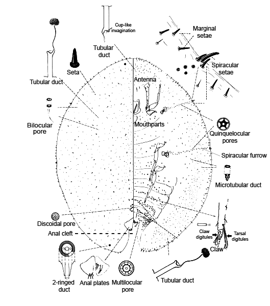 This family is so diverse morphologically that there are exceptions to most diagnostic characters. For example, Physokemes species lack anal plates; Sythia craniumequinum Kiritshenko lacks spiracular furrows; and Pseudophilippia quantancii Cockerell lacks differentiated spiracular setae. Coccidae Fallén was first used as a family by Samouelle (1819).