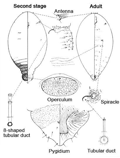 Body normally pyriform, occasionally subcircular or elliptical with the posterior end constricted and protruding. In cross section the body is flattened ventrally and convex dorsally. The adult female, and third-instar female (if present) occur inside a hardened test formed by the adult female. Pieces of the second instar may be incorporated in the test. Most writers suggest that the adult female occurs inside the shed skin of the second instar, but according to Kohler (1987) this is not true. Females remain inside the second instar, produce a test, and the second instar skin ruptures and disintegrates. White wax is not common in most species, but filamentous strands are occasionally present laterally. Specimens usually occur on the leaves of the host and are generally dark brown or black.