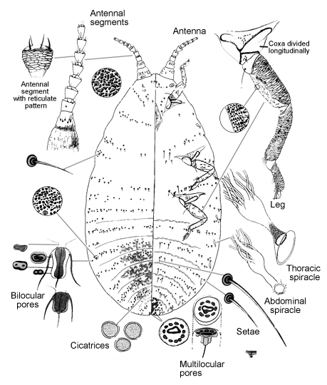 Without distinct anal opening; tarsi 2-segmented; with cicatrices; antennae with reticulate pattern; basal antennal segment noticeably longer than other segments; with 9 antennal segments; coxa divided longitudinally; without campaniform sensilla on tarsus; with 2 capitate claw digitules.