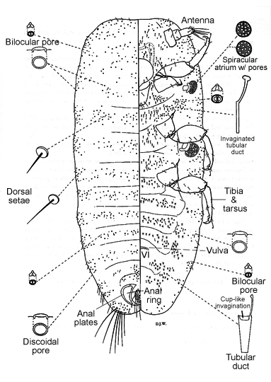 Unique characters of the family include the presence of apparent anal lobes; discoidal pores with unusually thick margins; and the vulva which is located on abdominal segment 6. Other characters include spiracles with pores in the atrium; anal plates surrounding the anal opening; antennae 3-segmented; labium 1-segmented; legs usually with tibia and tarsus fused; invaginated tubular ducts.