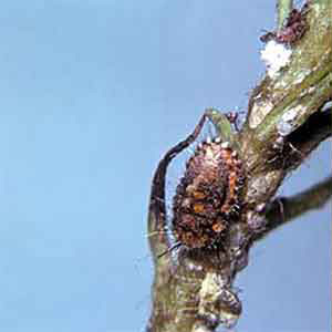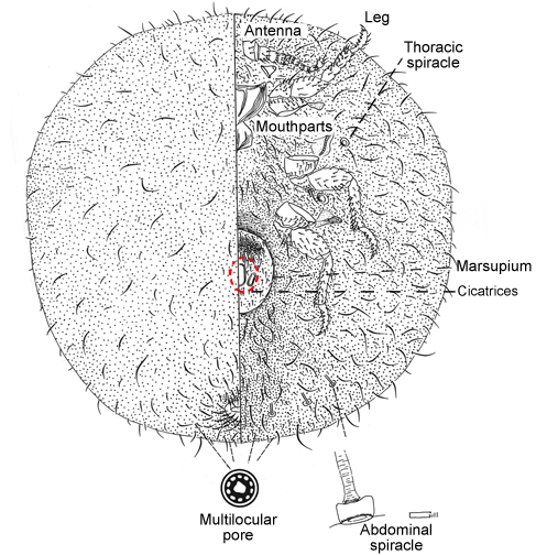 Giant scales have relatively simple life history patterns compared with cyst forming margarodoids. In general they have 4 female instars and 5 male instars, but unlike most other scale insects, the prepupa is quite mobile and although it may have wing buds, the legs and antennae are well developed (Morales 1991). Drosicha mangiferae Green has 1 generation each year. Eggs hatch in December or January after diapausing in ovisacs in the soil or the duff around the host. First instars move to the leaves and molt 3 times to become adults. Males are indistinguishable from females until the third instar prepupa. The prepupa wanders for a while, forms a waxy test, and molts to the pupal stage. Adults appear in April, mate, and migrate off of the host to the ground where an ovisac is produced and eggs are laid. The life cycle of Icerya purchasi Maskell is similar but developing females lay their eggs directly on the host in a fluted ovisac that is attached to the body of the adult female. Males are uncommon. Females actually are hermaphrodites that frequently inseminate themselves. Adult males mate with females, but it is not clear if their sperm are used for reproduction (Hughes-Schrader 1930). Inseminated eggs produce hermaphrodites and uninseminated eggs produce males. There are 2 or 3 generations each year depending on the climate.