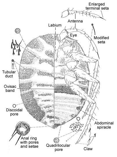 Anal ring on dermal surface, with pores and setae; apex of antenna with thick terminal seta; abdominal spiracles present; eyes stalked; predominant pore type quadrilocular; usually with ovisac band around perimeter of ventral abdomen.