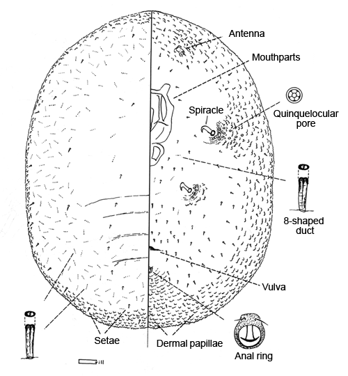 Body small, about 1.5 mm long, spherical, red or reddish brown, embedded or nested in white wax; often rubbed, exposing red color of body. Occurring on white tissues at base of fronds, occasionally on exposed roots and fronds.