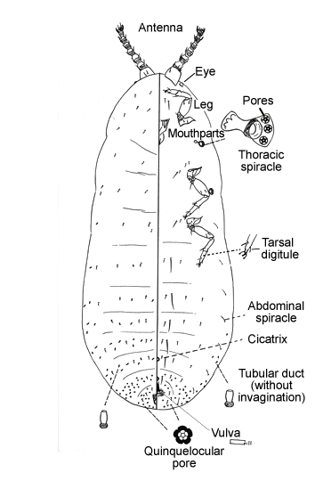 Eight abdominal spiracles; cicatrices present medially near vulva, similar in appearance to circuli; coxa divided longituinally; fewer than 10 setae on hind tibia (when present); pores in atrium of thoracic spiracles; basal antennal segment longer than other segments; tubular ducts without invagination.