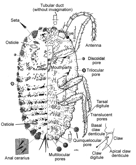 Body large and rotund; claw with basal denticle in addition to subapical denticle; cerarii large and conspicuous; trochanter with 3 or 4 pores on each surface; with trilocular pores, ostioles, translucent pores on hind legs, and usually with a circulus.