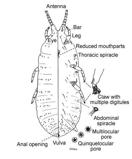 Claw with 6 or more digitules; 5 or 6 pairs of abdominal spiracles; first antennal segment with conspicuous bar; first antennal segment noticeably longer than other antennal segments; quinquelocular or multilocular pores scattered over body; 1 pair of unusually long setae on venter of each body segment.