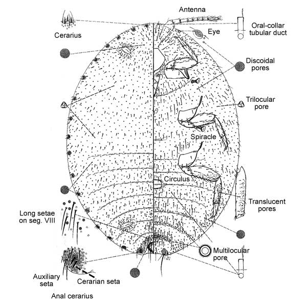 Body oval or rotund; pink or pink-orange; legs yellowish brown; body covered by thin layer of white mealy wax allowing body color to be visible, without bare areas on dorsum; dorsal ovisac absent, a few filamentous strands on venter; with 17 pairs of conspicuous lateral wax filaments, often slightly curved, posterior pairs longest, one-third to one-half as long as body, anterior filaments shorter than posterior pairs. Occurring on all parts of plant, usually in protected area. Ovoviviparous, eggs pink.