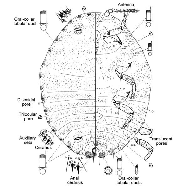 Dorsal margin of body with several large oral-collar tubular ducts; cerarii, excluding anal lobe pair, usually with 3 or more conical setae; dorsal abdominal segments VII and VIII usually with setae conspicuously longer than other dorsal setae; translucent pores on hind coxa, femur, and tibia, rarely also present on trochanter; ventral multiloculars usually restricted to posterior 3 segments, rarely on segments V and VI also.