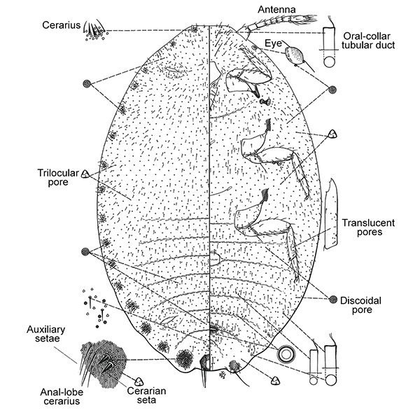 At least 1 discoidal pore near eye; anal-lobe cerarii with 2 conical setae; translucent pores present on hind coxa, trochanter, femur, and tibia; abdominal cerarii usually with more than 2 conical setae; without cluster of oral-collar tubular ducts laterad of anterior spiracle; ventral multilocular pores restricted to posterior 3 abdominal segments; oral-rim tubular ducts absent; cerarii with auxiliary setae; 17 pairs of cerarii.