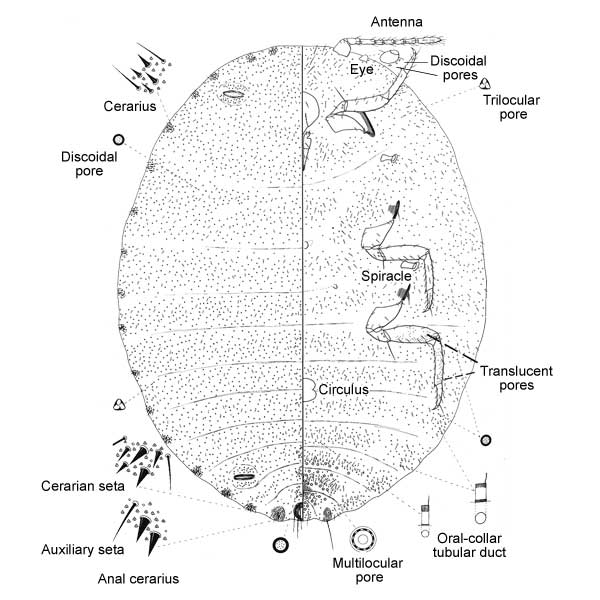 Body oval or rotund; gray or gray-orange; legs yellowish brown; body covered by flocculent white mealy wax, without bare areas on dorsum; dorsal ovisac absent, a few filamentous strands on venter; with 17 pairs of conspicuous lateral wax filaments, often slightly curved, posterior pairs longest, one-third to one-half as long as body, anterior filaments shorter than posterior pairs. Primarily occurring on above ground parts of host. Ovoviviparous.