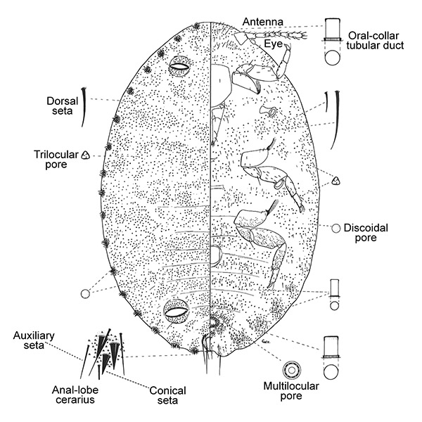Anal-lobe cerarii usually with more than 2 conical setae; translucent pores present on hind coxa, trochanter, femur and tibia; abdominal cerarii usually with more than 2 conical setae; without a discoidal pore near the eye; without cluster of oral-collar tubular ducts laterad of anterior spiracle; ventral multilocular pores restricted to posterior 3 abdominal segments; oral-rim tubular ducts absent; cerarii with auxiliary setae; 17 pairs of cerarii.