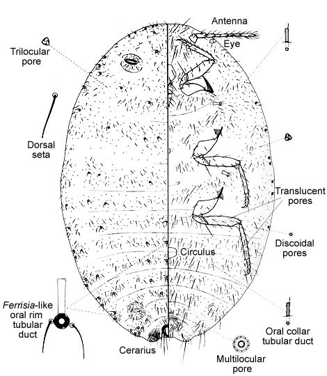 Within Ferrisia-like tubular ducts, dark rim around opening of duct orifice is called sclerotization A, lighter area outside of A is called sclerotization B. Discoidal pores incorporated in or touching A; setae associated with ferrisia-like tubular ducts usually touching A; sclerotization B on anterior abdominal segments usually weakly developed or absent; body rotund; without clusters of small oral-collar tubular ducts ventrally on posterior abdominal segments; ventral multiloculars usually restricted to posterior 2 abdominal segments; 1 pair of cerarii.