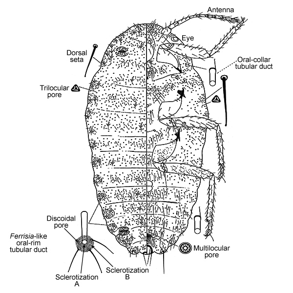 Within Ferrisia-like tubular ducts, dark rim around opening of duct orifice is called sclerotization A, lighter area outside of A is called sclerotization B. Discoidal pores incorporated in or touching A; setae associated with ferrisia-like tubular ducts located in middle of B, not touching A; sclerotization A clearly present and well developed; body elongate oval; without clusters of small oral-collar tubular ducts ventrally on posterior abdominal segments; ventral multiloculars usually restricted to posterior 2 abdominal segments; 1 pair of cerarii.
