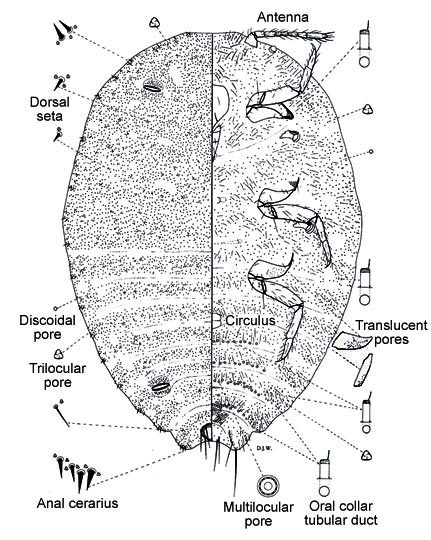 Multiple conical setae in most abdominal cerarii including anal lobe cerarii; 18 pairs of cerarii; anal bar present; ventral oral-collar tubular ducts laterad of front coxa and on head; dorsal setae conical; translucent pores on hind coxa and tibia; ventral multilocular disk pores in medial areas of segments IV to VIII.