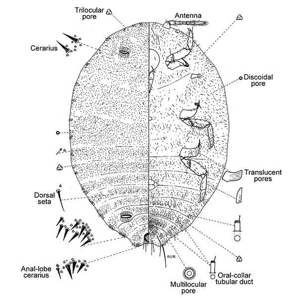 Cerarii with more than 3 conical setae; cerarii on abdomen without auxiliary setae; circulus present; oral-collar tubular ducts absent from venter of head and thorax; dorsal setae stiff; multilocular disk pores on segments V-VIII; sometime with multilocular pores near body margin; hind coxa about same shape as anterior coxae; anal bar present; translucent pores on hind coxa and tibia.
