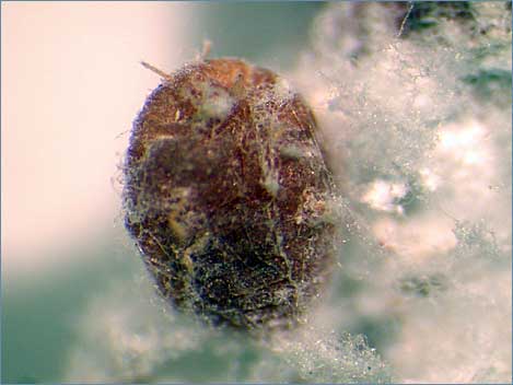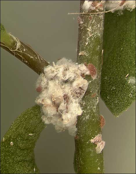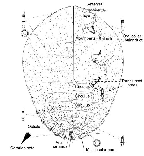 Body rotund to eliptical; rounded in lateral view; body pink to pink-yellow; legs light yellow; dorsal ovisac present in all instars, covering entire dorsum, very filamentous; mealy wax lightly dusted over body, lateral filaments absent. Occurring on all above ground parts of plant, often in clumps at nodes, usually in protected areas. Oviparous, eggs pink, hatch soon after being laid.
