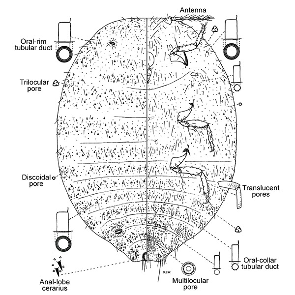 Maconellicoccus multipori is similar to M. hirsutus by having an anal bar, dorsal oral-rim tubular ducts, cerarii restricted to abdomen, and antennae 9-segmented. Maconellicoccus multipori can be distinguished (characters of M. hirsutus given in parentheses) by lacking a circulus (present) and dorsal oral-collar tubular ducts absent (present).