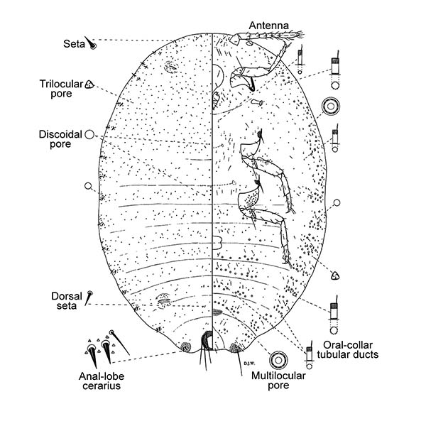Oral-collar tubular ducts and multilocular pores in clusters along ventral body margin; translucent pores on hind coxa, sometimes on tibia also; 14 to 16 pairs of cerarii; circulus present, usually rectangular; some dorsal setae conical, not as large as cerarian setae.