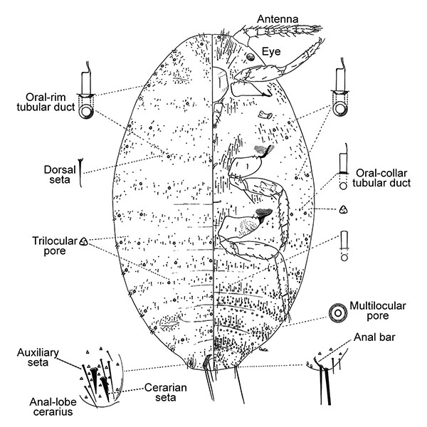 Oral-rim tubular ducts present ventrally on head and anterior thorax; multilocular pores present or absent from lateral areas of abdominal segments; multilocular pores present on segments IV-VIII, absent from thorax and head; small cluster of oral-collar tubular ducts laterad of anterior spiracle; oral collars absent laterad of mid pair of legs; circulus normally present, rarely absent; cerarii with 2 conical setae; 9-17 pairs of cerarii, some present on anterior thorax and head; oral-rim tubular ducts covering dorsum, absent from segment VIII; anal bar present.