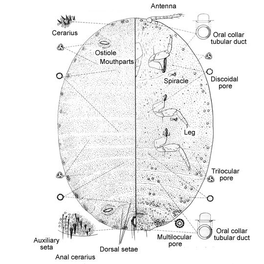 We have been unable to locate a description of the field characteristics of this species in the literature. Based on characteristics of slide-mounted adult female: body round; ovisac absent from dorsum and poorly developed or absent on venter; 17 pairs of thick lateral filaments, possibly coalescing, posterior pair only sightly longer than others, surrounding body margin; body covered by thick white mealy secretion. On all parts of orchid host including roots.