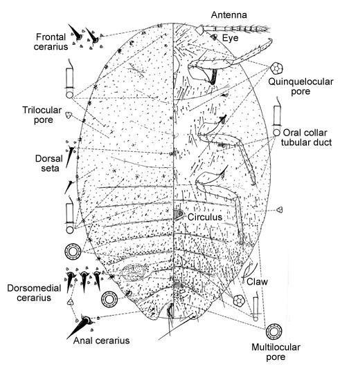Dorsomedial cerarii on midline of abdominal segments VI and VII; multilocular pores on dorsum of abdomen, absent from thorax and head; dorsal oral-collar tubular ducts scattered over surface; quinquelocular pores abundant on ventral surface; 18 pairs of cerarii; denticle on claw; antennae 9-segmented.