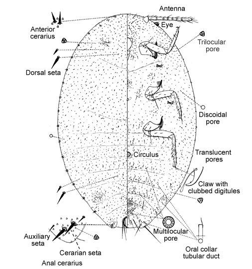 Body oval; slightly rounded in lateral view; body color variable from light yellow to brown; legs red; covered by white, mealy wax; some specimens with medial wax crest; with faint submedial bare areas on abdomen of some specimens, these areas forming 1 pair of longitudinal lines on dorsum; ovisac absent; with 18 pairs of short lateral wax filaments, anterior pairs broken or very small, thim, posterior pairs broad, longest, about 1/8 or less of length of the body. Primarily occurring on subterranean parts of host, but occasionally on foliage. Surface of lateral filaments rough.