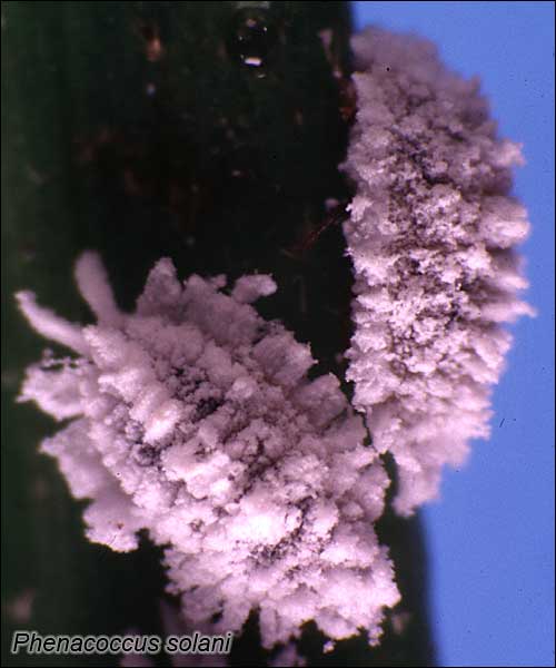 Phenacoccus solani is very similar to P. solenopsis Tinsley by lacking quinquelocular pores, dorsal multilocular pores, and dorsal oral-collar tubular ducts. Phenacoccus solani differs by having multilocular pores from segment IV to VIII; 8-segmented antennae; a small circulus; and translucent pores on tibia only, whereas Phenacoccus solenopsis has multiloculars restricted to segment VI, VII, and VIII; 9-segmented antennae; a large flaccid circulus; and translucent pores on apex of hind femur and on tibia.