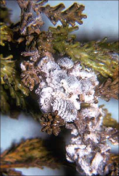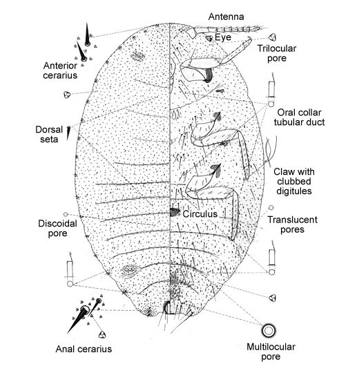 Body oval, often quite large (5 mm); somewhat rounded in lateral view; dark green almost black; legs red; covered by thin, white, mealy wax, with dark dorsosubmedial bare spots on intersegmental areas of thorax and abdomen, these areas forming 1 pair of dark longitudinal lines on dorsum; ovisac absent from dorsum, but well developed ventally; with 18 pairs of lateral wax filaments, posterior pairs longest, up to _ of length of the body. Normally occurring on crown of host. Surface of lateral filaments rough.