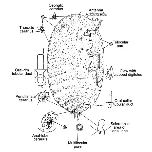 Cerarii number 14-16 pairs, some absent on thorax and head; multilocular pores often restricted to vulvar area, sometimes with 1 or 2 on segment VI; dorsal oral-rim tubular ducts few in numbers, sometimes restricted to marginal areas, usually with 2 or 3 in medial or mediolateral areas of thorax; ventral oral rims sometimes absent, often with a few in marginal areas of head and thorax; circulus small or absent; dorsal setae elongate; vulva saccate; auxiliary setae present in cerarii; antennae 7- or 8-segmented.