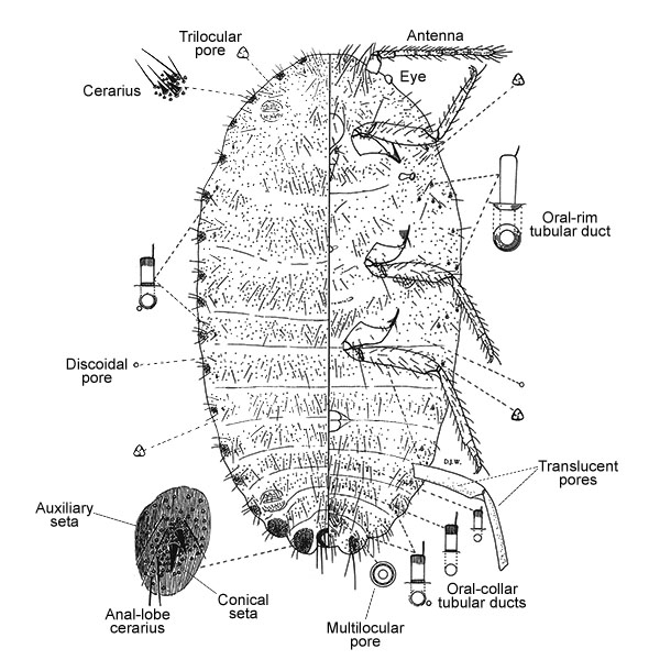 Oral-rim tubular ducts restricted to venter, on dorsum replaced by oral-collar tubular ducts with a narrow rim located on submargin; multilocular pores normally restricted to segment VIII and numbering 3-5 pores, rarely with 1 on segment VII; dorsal setae elongate, mostly more than 100μ long; vulva saccate, with 4 ducts; translucent pores present on hind femur and tibia; oral-collar tubular ducts usually absent laterad of anterior spiracle; 17 pairs of cerarii with auxiliary setae.