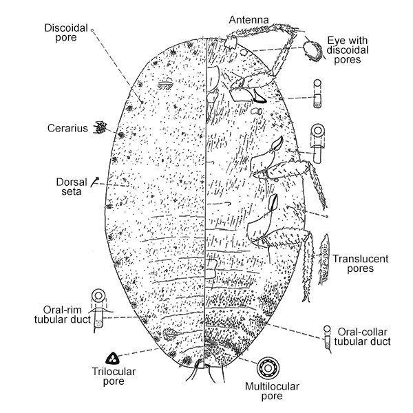 Translucent pores restricted to hind tibia; dorsal oral-rim tubular ducts present between cerarii 15 and 16; with or without oral-collar tubular ducts laterad of anterior spiracle; discoidal pores associated with eye, often with small rim; 16 or normally 17 pairs of cerarii; cerarii with auxiliary setae.