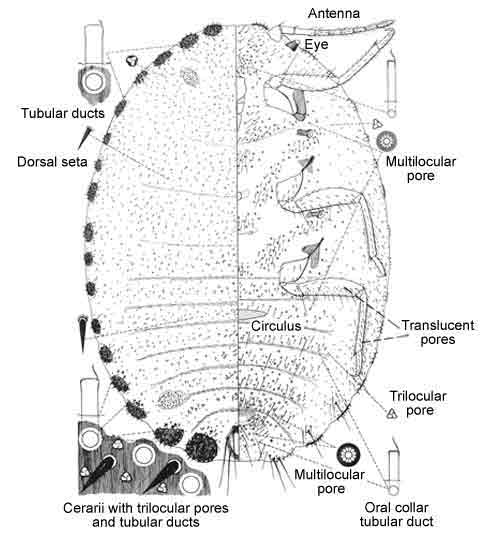 With 5 or more tubular ducts in cerarii; circulus elongate oval, not divided; dorsal conical setae smaller than cerarian setae, not gathered into clusters; cerarii all with considerable basal sclerotization; each cerarius containing 6 or more conical setae; with 17 or 18 pairs of cerarii on each side of body; antennae 9-segmented; multilocular disc pores scattered over ventral surface; basal and plantar denticles present on claw.