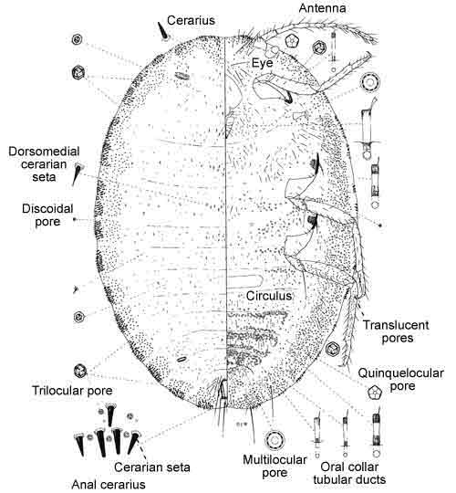Anterior ostioles present; cerarii with more than 5 truncate setae; cerarii on anterior thorax and head coalesced; with long dorsal setae adjacent to anal ring; antennae 9-segmented; quinquelocular pores present on venter; denticle on claw.