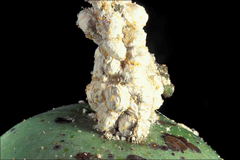 Body oval to round; slightly rounded to convex in lateral view; light yellow; legs light yellow; mealy wax covering thick, in median area forming medial longitudinal ridge on thorax and abdomen; without longitudinal bare areas on dorsum; ovisac ventral, copious, tilting posterior end of female off of host substrate when fully developed, similar in appearance to cottonycushion scale (Icerya purchasi Maskell); lateral wax filaments variable in number, coalescing through time, when separate, broad at base narrowing to rounded point at apex, ultimately forming plate-like fringe around body, anterior filaments nearly 1/2 as long as width of body, posterior filaments slightly longer than others, about 1/4 length of body. Occurring on foliage, stems, and fruit of host. Oviparous, eggs honey yellow. Surface of lateral filaments smooth.