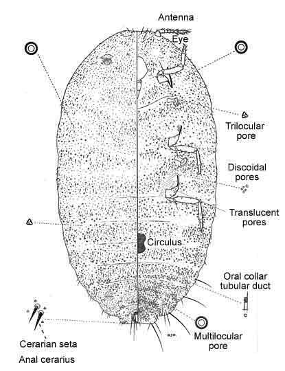 Circulus hour-glass shaped; small discoidal pores surrounding hind coxae; cerarii restricted to anal lobes; posterior abdominal segments each with single, long seta protruding from each body margin; multilocular pores present on dorsum and venter.