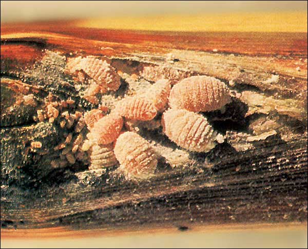 Body elongate oval, often quite large (7mm); convex in lateral view; body pink; mealy wax thin, allowing body color through; without longitudinal bare areas on dorsum; ovisac ventral; lateral wax filaments normally absent, 1 short pair may be visible in newly matured adult females. Occurring in leaf sheats of grass host.